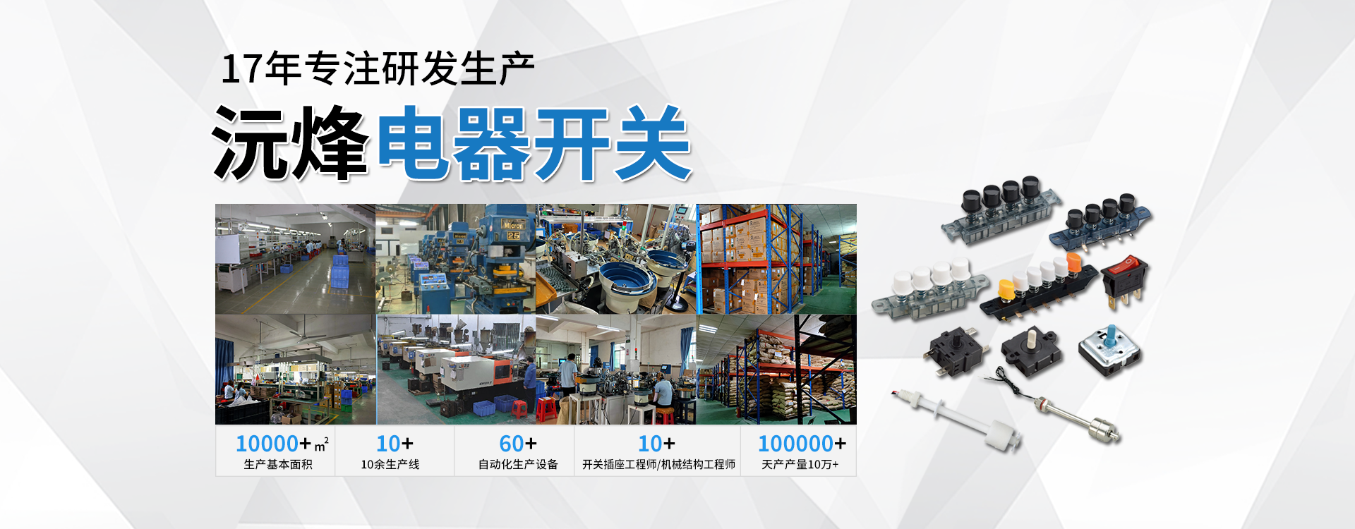 佛山市順德區沅烽電器有限公司是一家自主研發及生產各種電器開關以及接線端子座企業,產品主要有浮球開關、琴鍵開關、旋轉開關、微動開關、按鍵開關等系列,產品廣泛應用在空調、電風扇、電飯煲、電暖器、電烤箱、微波爐、榨汁機、攪拌機等家電行業。 本公司提供產品從設計開發到制造檢驗及跟蹤服務的全部流程,自主擁有模具設計制造、自動沖壓、精密注塑成型及組裝等部門。公司不斷完善檢測體系并引進高精度檢測儀器,其中有被美國安全試驗檢驗公司即UL公司認可的安規實驗室。 本公司于2003年通過并實施ISO9001國際品質管理認證體系,產品相繼獲得CQC、CE、TUV、UL認證,同業內眾多知名企業如美的、TCL、海信科龍、格蘭仕等保持長期的合作關系,有部分產品出口多個國家。 我們堅持走專業化的道路,以一流的產品及服務答謝客戶,愿與各界朋友共創美好明天...        查看更多